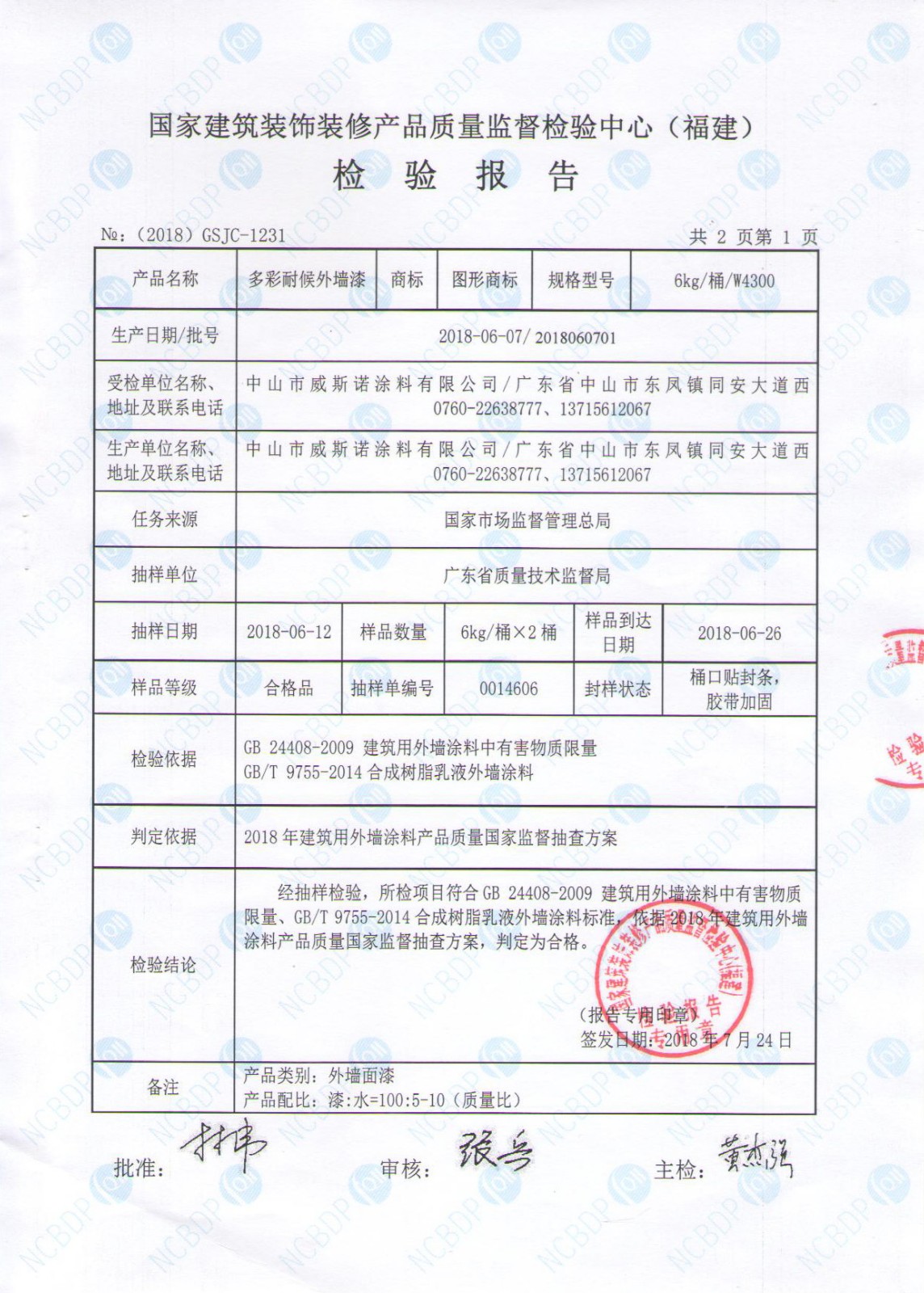 2018年國(guó)家市場(chǎng)監(jiān)督管理總局對(duì)我司生產(chǎn)建筑用外墻漆產(chǎn)品【多彩耐候外墻漆6kg/桶/W4300】進(jìn)行抽檢查驗(yàn)。