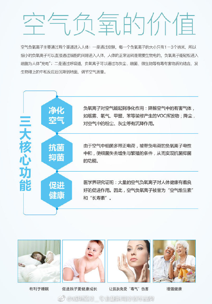空氣中負(fù)氧離子濃度是空氣質(zhì)量好壞的標(biāo)志之一,世界衛(wèi)生組織對(duì)清新空氣的負(fù)氧離子標(biāo)準(zhǔn)濃度也進(jìn)行了相關(guān)規(guī)定。根據(jù)聯(lián)合國衛(wèi)生組織的標(biāo)準(zhǔn),空氣中負(fù)氧離子含量達(dá)到每立方厘米1500個(gè)時(shí)是空氣清新的標(biāo)準(zhǔn)。達(dá)到每立方厘米2萬個(gè)以上,則具有醫(yī)療保健的功效。醫(yī)學(xué)研究表明:對(duì)人體有醫(yī)療保健作用的是小粒徑負(fù)氧離子。