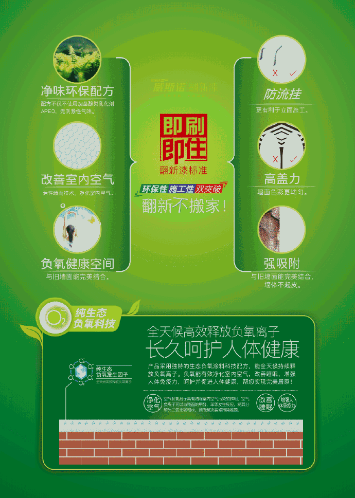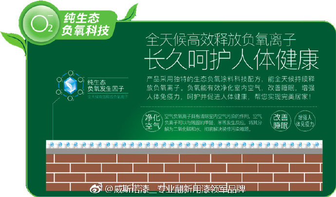 威斯諾——新森家硅藻抗甲醛內(nèi)墻翻新水漆專為室內(nèi)墻面翻新而開發(fā)的專用產(chǎn)品之一。產(chǎn)品以“即刷即住”翻新漆配方技術(shù)為核心,結(jié)合先進的制漆工藝生產(chǎn)而成。產(chǎn)品具有良好的施工寬容度,其遮蓋力和流平性佳,能讓墻面翻新更輕松。同時,產(chǎn)品采用獨特的生態(tài)負氧涂料科技配方,能全天候持續(xù)釋放負氧離子,負氧能有效凈化室內(nèi)空氣,改善睡眠,增強人體免疫力,呵護并促進人體健康,幫您實現(xiàn)完美家居!感謝關(guān)注威斯諾翻新漆!