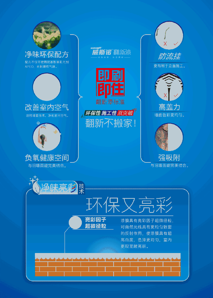 專為室內(nèi)墻面翻新而開發(fā)的專用產(chǎn)品之一。產(chǎn)品以“即刷即住”翻新漆配方技術(shù)為核心,結(jié)合先進(jìn)的制漆工藝生產(chǎn)而成。產(chǎn)品具有良好的施工寬容度,其遮蓋力和流平性佳,能讓墻面翻新更輕松。同時(shí),產(chǎn)品還融合了凈味亮彩技術(shù)和負(fù)氧活性技術(shù),漆膜具有亮彩因子超微經(jīng)粒,對(duì)自然光線具有更均勻致密的反射作用,使漆膜具有超亮白度,色澤更均勻,室內(nèi)更現(xiàn)寬敞亮麗。能讓翻新墻面具有更加亮麗細(xì)膩的漆面外,能有效改善室內(nèi)空氣質(zhì)量,讓您輕輕松松翻新家,亮麗效果勝新裝。