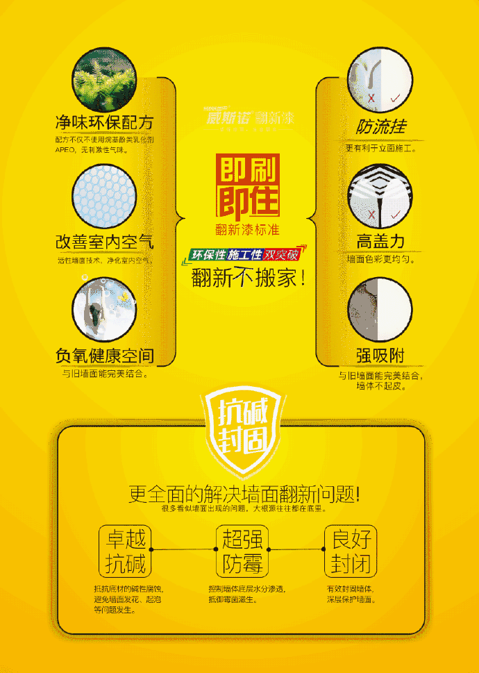 黃金甲純凈味全效內墻翻新底漆是威斯諾內墻翻新面漆的配套產品。采用先進凈味合成技術,全面大幅度降低水漆乳液的殘存氣味。在翻新中應用本品能有效封固基面,深層保護墻面,加強涂層的附著力,解決墻面漆膜起皮脫落、泛堿、發(fā)霉、發(fā)花等各類常見問題。同時,本品的應用還有利于減少面漆,讓面漆性能發(fā)揮更全面。