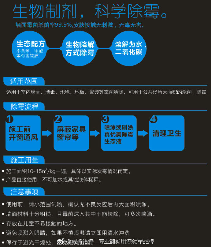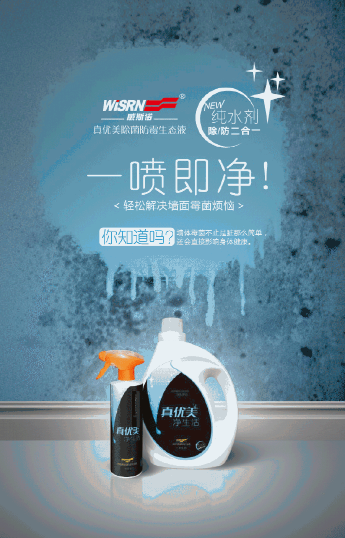 “真優(yōu)美”除菌防霉生態(tài)液產(chǎn)品,采用高科技的新一代除霉配方,內(nèi)含多種除霉因子,對霉菌進(jìn)行迅速分解。純水劑,除/防二合一,安全環(huán)保。10-30分鐘快速見效,輕松解決墻面霉菌煩惱。
