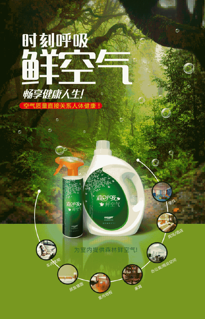 森呼吸負氧生態(tài)液對家庭住房、賓館、酒店、營業(yè)場所,空氣質(zhì)量較差的室內(nèi)使用,能有效釋放負氧離子,改善空氣,讓你置身于森林中。