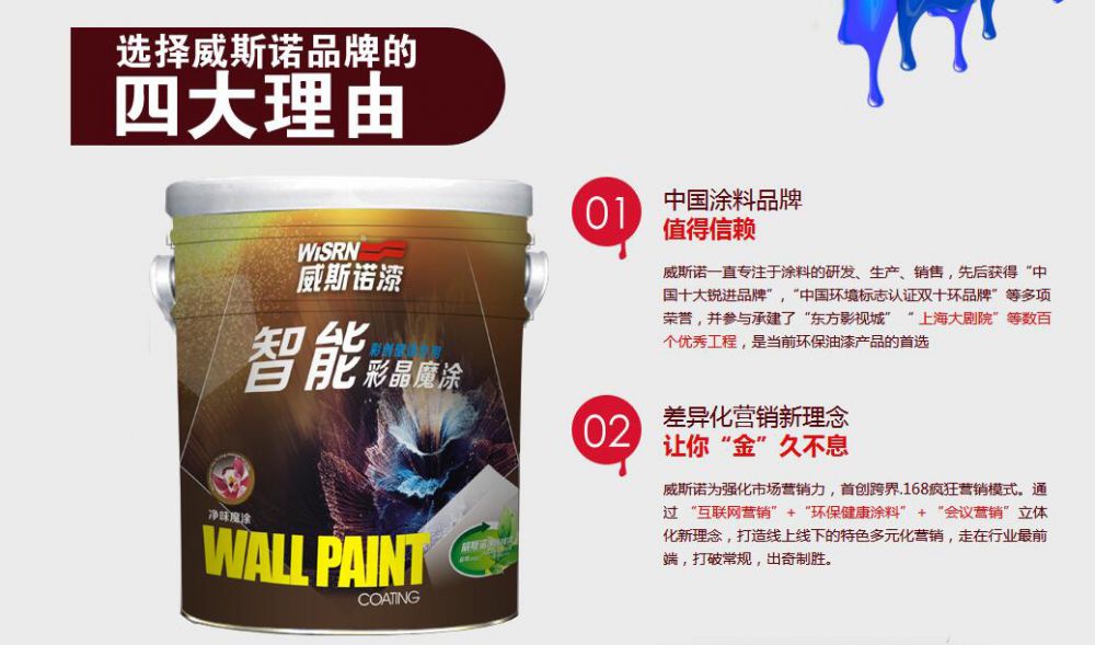 威斯諾質(zhì)量最好的涂料品牌企業(yè)文化企業(yè)精神:誠信,積極,創(chuàng)新,拼搏,務(wù)實企業(yè)目標(biāo):打造完美,創(chuàng)建涂料行業(yè)第一品牌經(jīng)營理念:誠信第一、質(zhì)量第一、客戶第一、服務(wù)第一、...