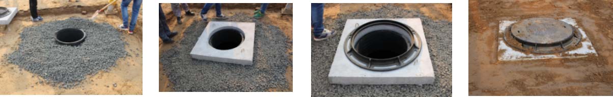 1.厚度30mm的褥墊層 2.安裝水泥承壓圈 3.安裝井蓋座 4.安裝井蓋