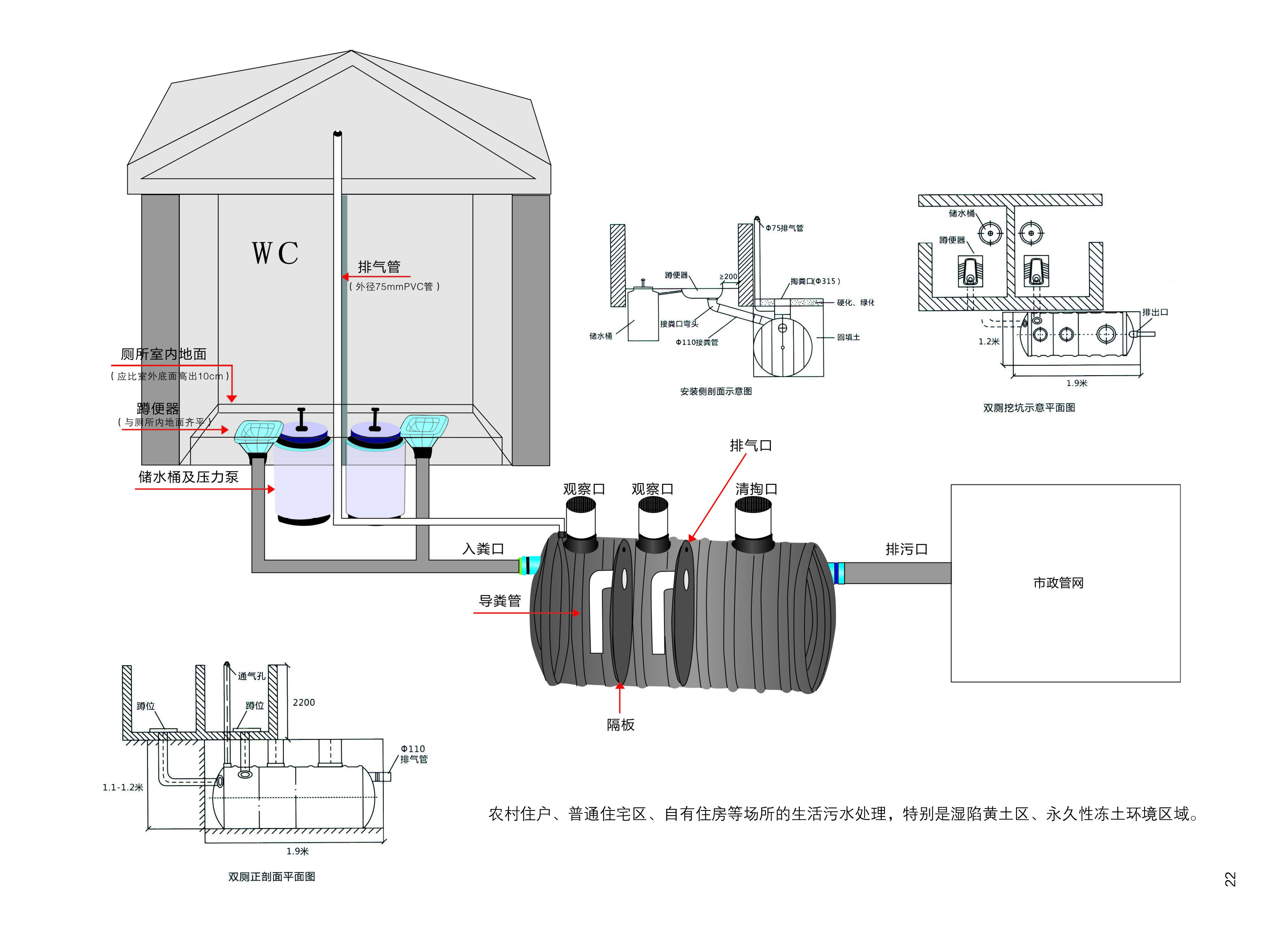 塑料“三格式”化糞池一般是與水沖式廁所相配套,由進水管、分格池、過糞管、蓋板等部分組成。其容積應根據使用人數、沖水量、糞便發酵腐熟的時間以及沉卵滅菌的要求來決定。